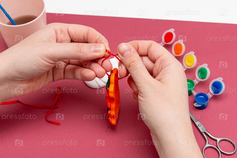 Женщина рисует гипсовые фигуры снеговика, оленя и рождественской елки с цветными красками гуаши, новогодние ручные игрушки декор