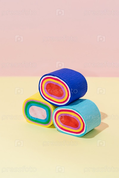 Творческие абстрактные рулоны суши плоские, лежащие на пастельно-розовом и желтом фоне минимализма
