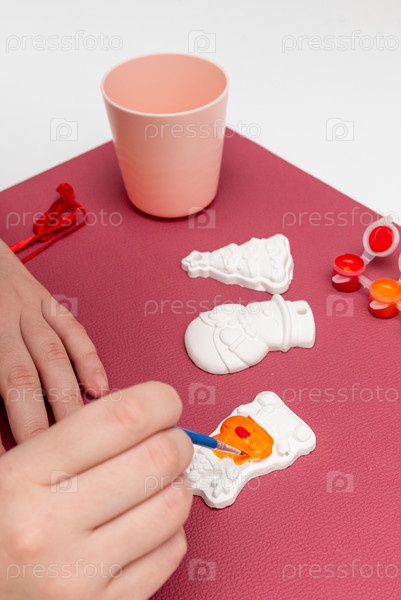 Женщина рисует гипсовые фигуры снеговика, оленя и рождественской елки с цветными красками гуаши, новогодние ручные игрушки декор