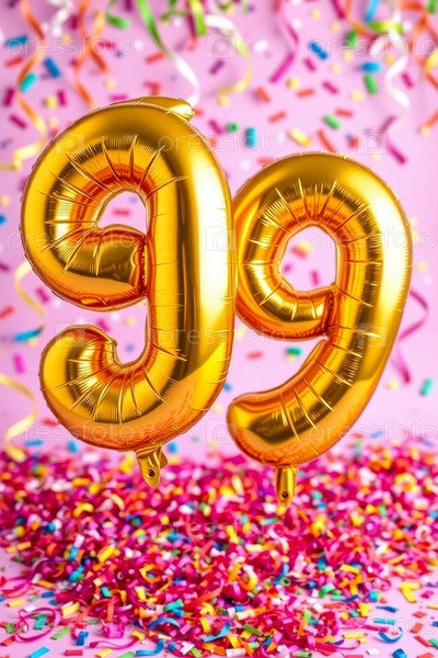 Гелий день рождения воздушный шар формы номер девяносто девять, золотые буквы фигура 99 праздник праздничный фон декор
