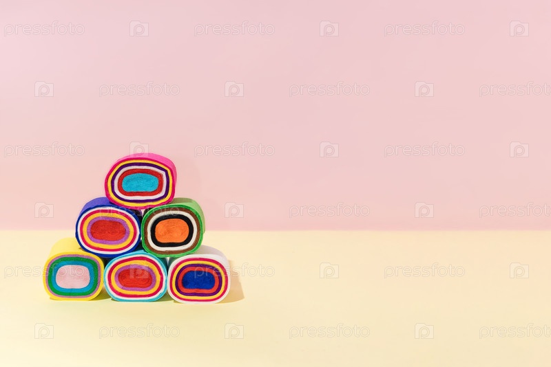 Креативные абстрактные свитки суши плоский лежит на пастельно-розовом и желтом фоне минимализм с копированием пространства
