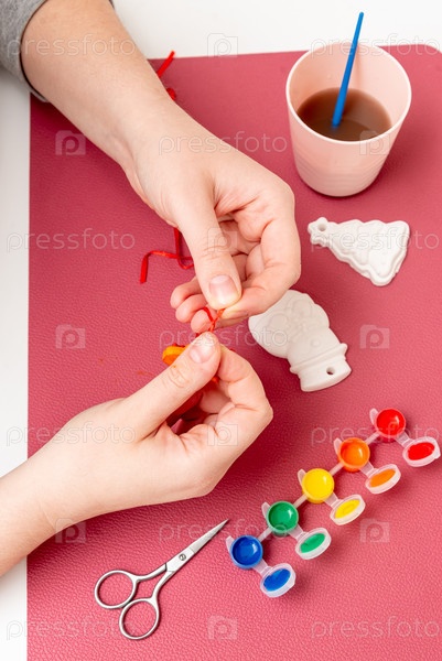 Женщина рисует гипсовые фигуры снеговика, оленя и рождественской елки с цветными красками гуаши, новогодние ручные игрушки декор
