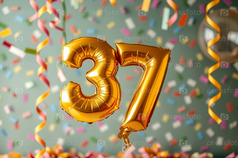 Гелий день рождения воздушный шар номер тридцать семь, фигура золотой буквы 37 праздник праздничный фон