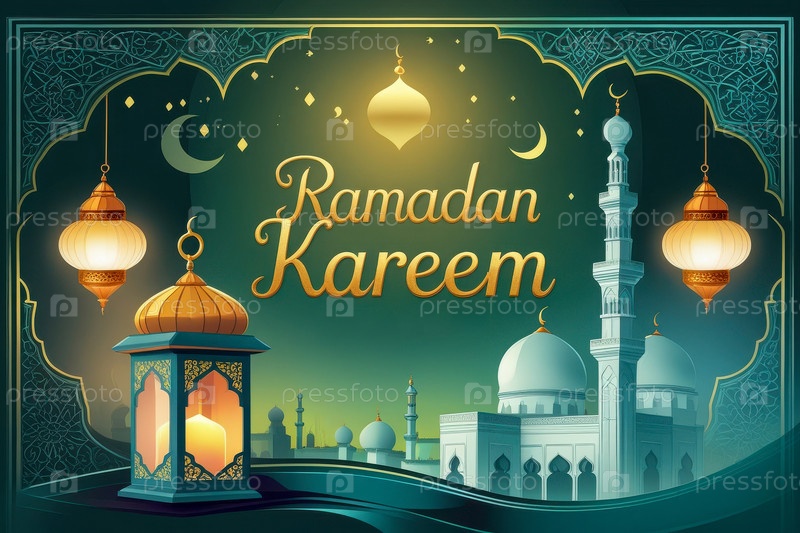 Поздравительная карточка с традиционным мусульманским исламским праздником Рамадан с вероучениями символ веры ИИ генеративный
