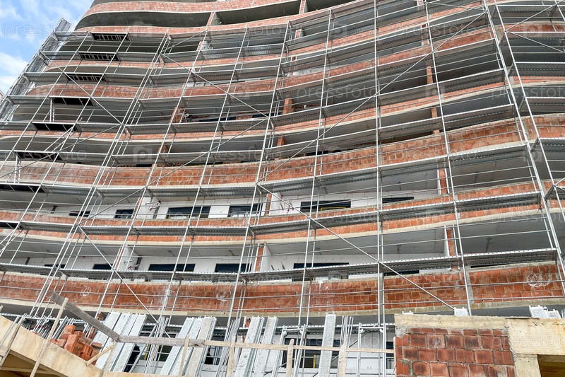 Здание, находящееся в стадии строительства с лесами, многоэтажное каркасное здание
