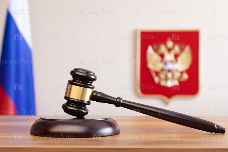 Судебный молоток на фоне флага и герба России