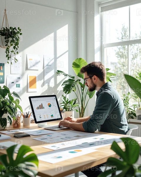 Мужчина, работающий над дизайном интерфейсов (UI / UX) в современном домашнем офисе. Он сосредоточенно изучает графику и схемы на экране планшета, рядом лежат распечатанные эскизы и макеты. Пространство заполнено естественным светом благодаря большим окна