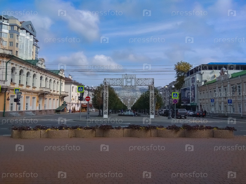 Уличный пейзаж Новороссийска с декоративной аркой и историческими зданиями на фоне ясного неба