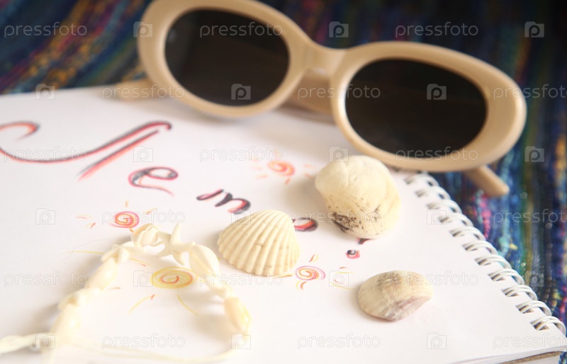 Браслет, раковины, солнцезащитные очки и тетрадь с надписью "лето" на столе