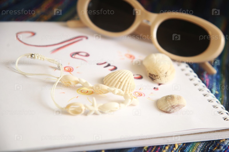 Браслет, раковины и солнцезащитные очки лежат на блокноте с надписью "лето" на столе
