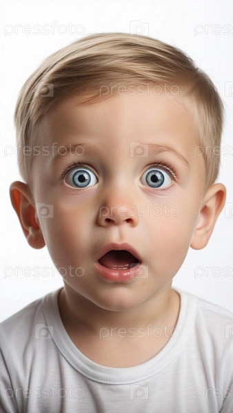 Удивленный маленький мальчик на белом фоне. Портрет удивленного мальчика. Смешной ребенок открыт рот от удивления