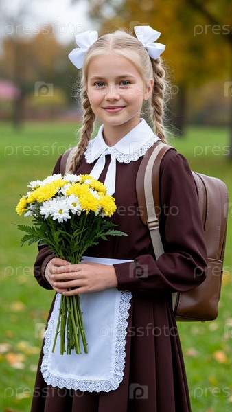 Школьница в школьной форме с белыми фартуками и бантами. Ученица на 1 сентября в парадной школьной форме с букетом цветов