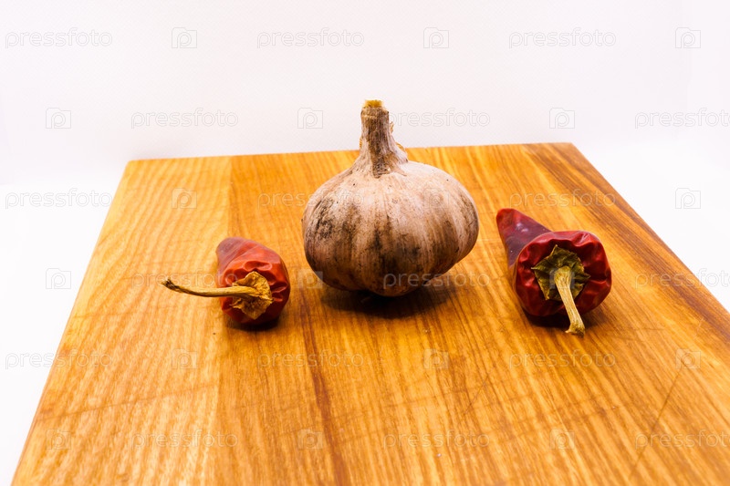 Натюрморт. Головка чеснока и стручки жгучего перца на разделочной доске