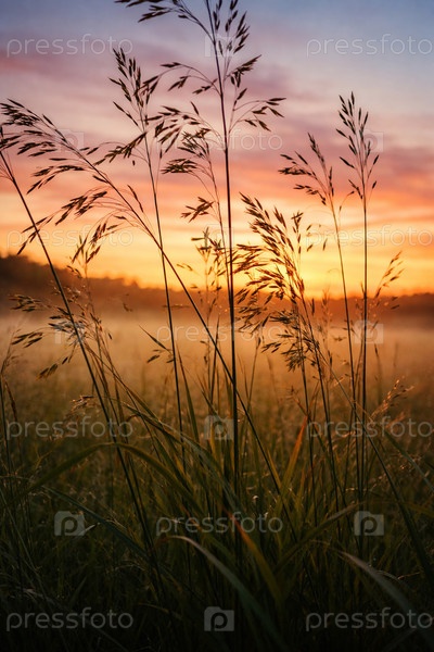 Закат в поле около леса с туманом и травой