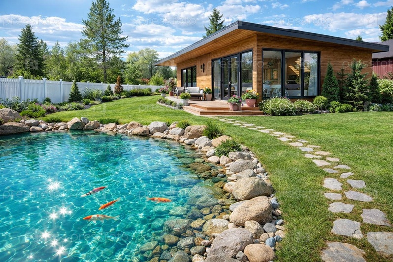Территория загородного участка с домом и прудом. Ландшафтный дизайн