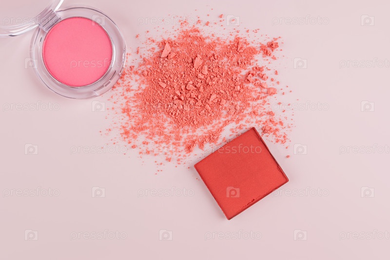 Красивый косметический фон с набором различных тонов красного цвета в открытых упаковках и текстуры декоративной косметики