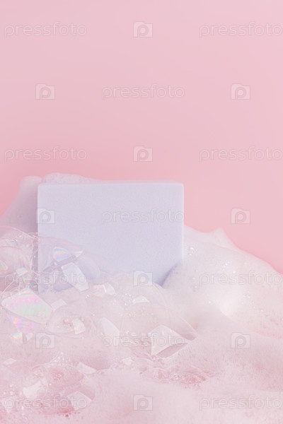 Белая подиум стоит в пушистой плотной белой пены мыла с большими прозрачными пузырями. вертикальный вид спереди. розовый фон. макет для дизайна