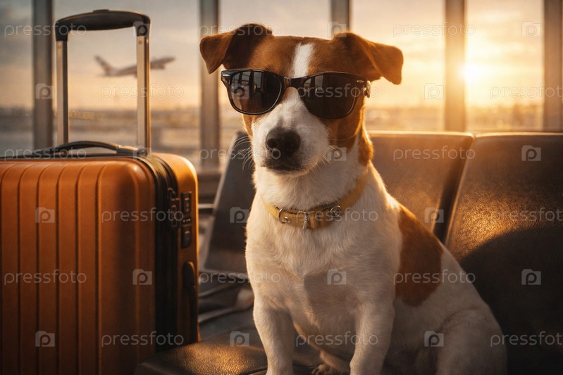 Портрет Джек Рассел терьера в аэропорту в зале ожидания в солнечных очках