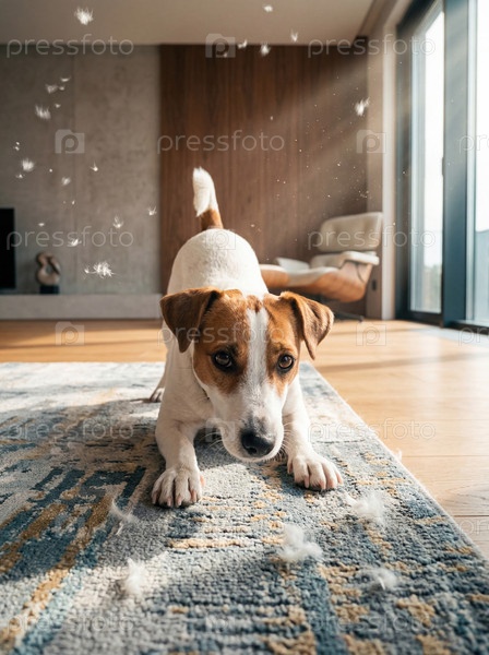 Собака Джек Рассел Терьер играет с летающим пухом дома