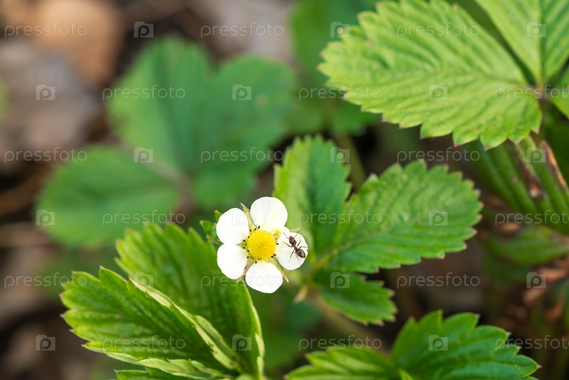 Муравей, ползущий по лепесткам цветущего клубничного куста в саду весной