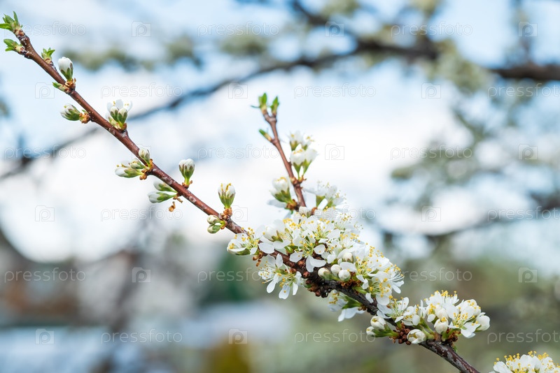 Ветка цветущего сливового дерева в саду весной