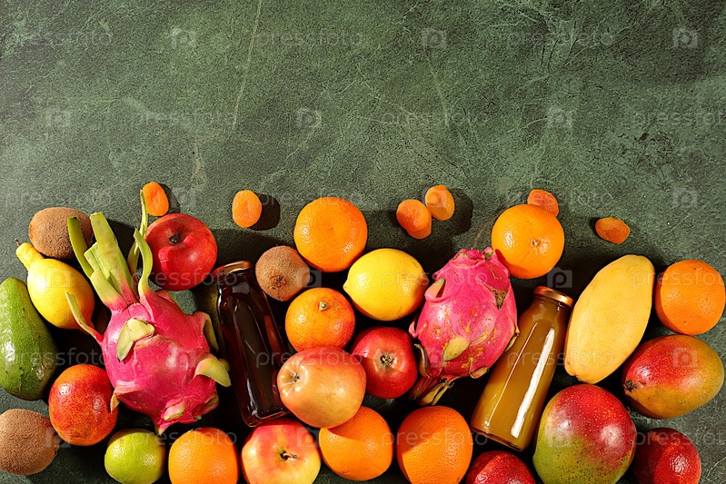 Флаер с тропическими экзотическими фруктами, летними каникулами и концепцией здорового образа жизни. Рекламная карточка для рынка или магазина с пространством для текста. Здоровая вегетарианская еда для похудения