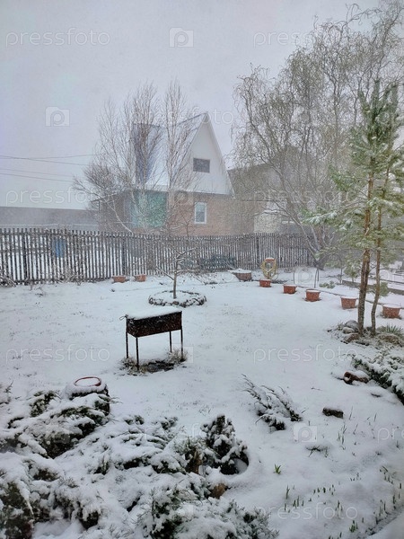 Первый снег, который покрыл землю, деревья и посадки