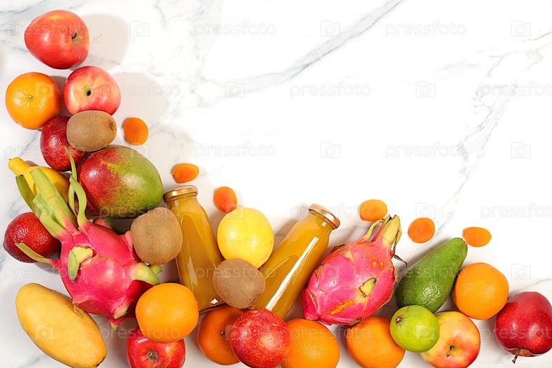 Драконьи фрукты, питая, манго, киви, авокадо, яблоки, цитрусовые и апельсины на солнечном столе. Летний баннер с тропическими экзотическими плодами. Здоровая вегетарианская еда для похудения, рекламная открытка