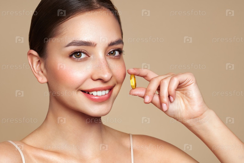 Красивая девушка с таблеткой с маслом печени трески Омега-3