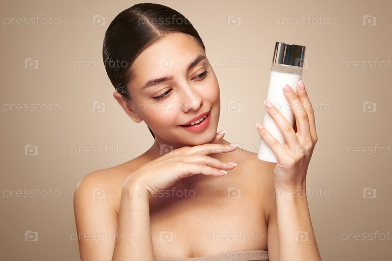 Улыбающаяся женщина держит бутылку с косметическим молоком