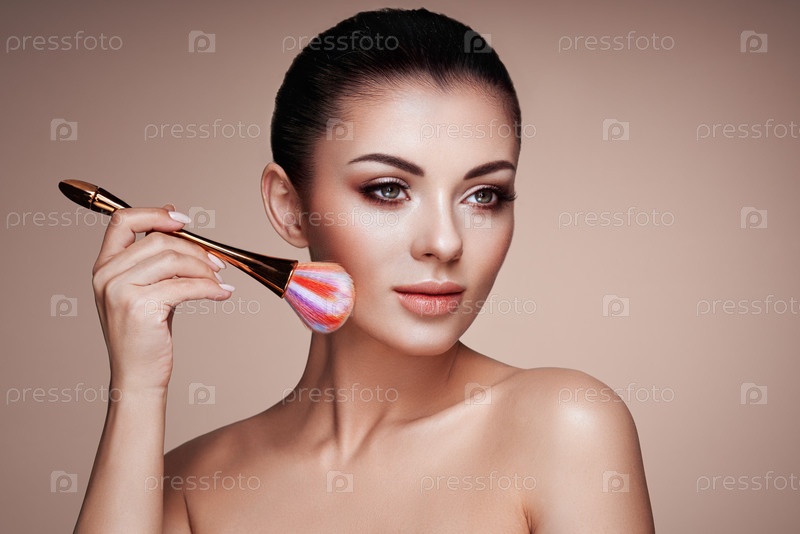 Красивая женщина наносит тон кожи с помощью кисти