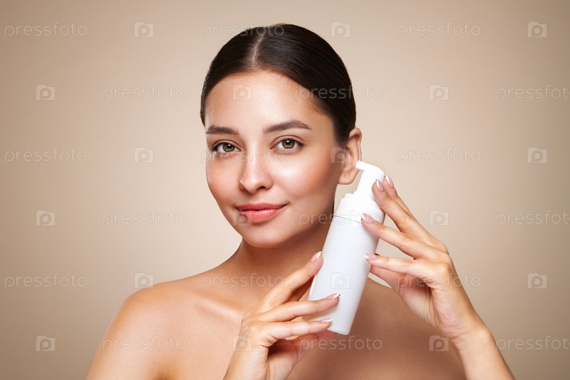 Молодая женщина демонстрирует бутылку с пенным распределителем для стирки