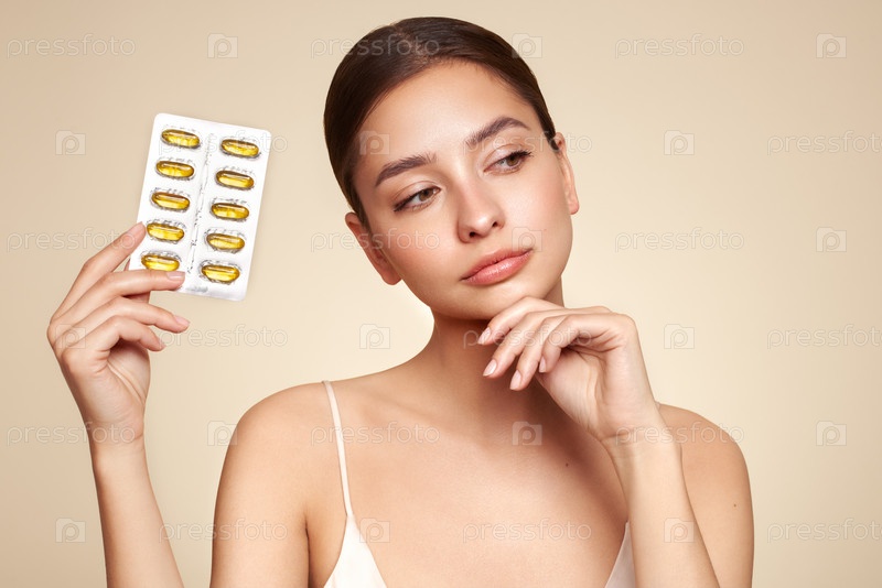Красивая девушка с таблеткой с маслом печени трески Омега-3