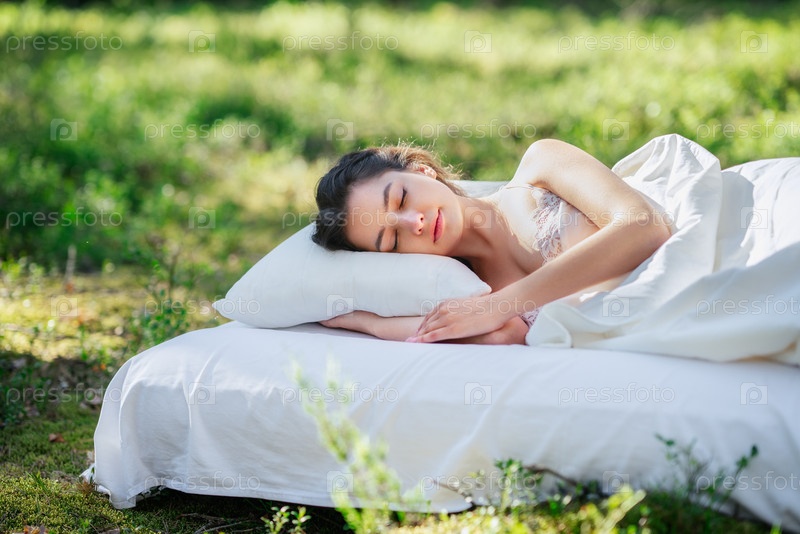 Женщина спит на матрасе в летнем лесу