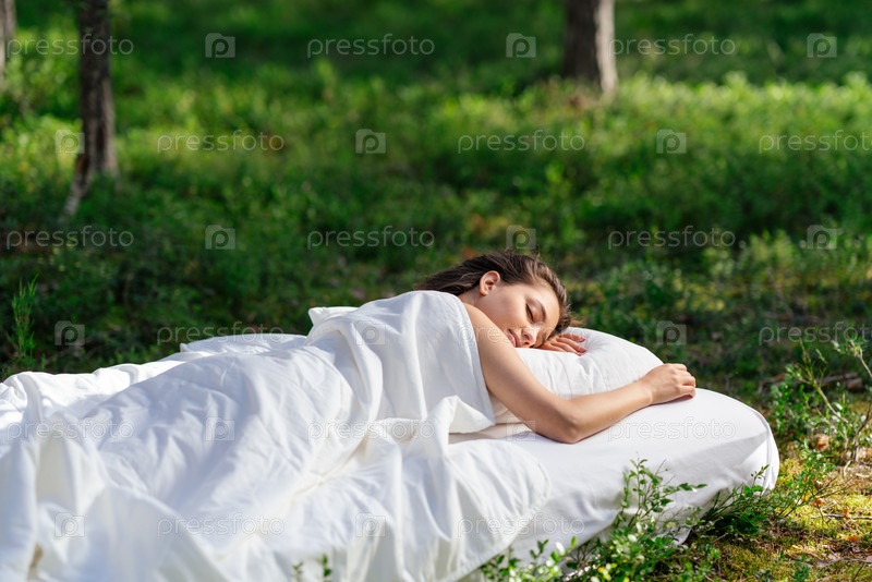 Женщина спит на матрасе в летнем лесу