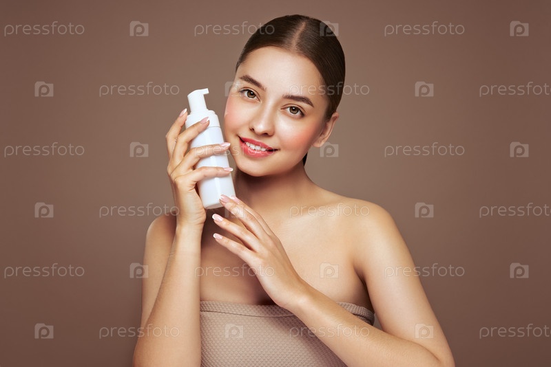 Молодая женщина демонстрирует бутылку с пенным распределителем для стирки