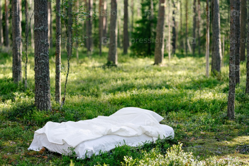 Кровать в лесу, окруженная деревьями