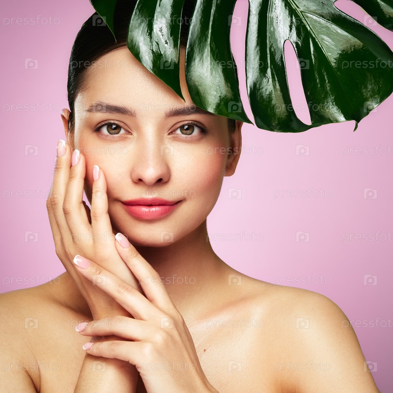 Закройте женское лицо с зеленым экзотическим листом