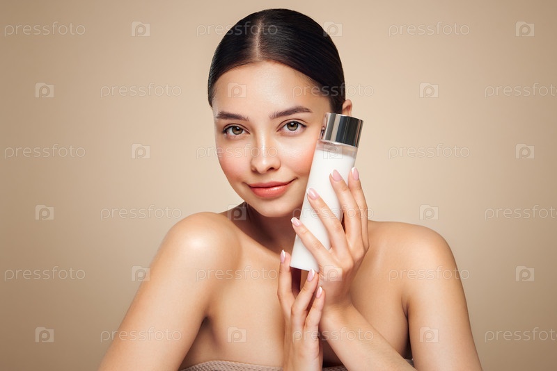 Улыбающаяся женщина держит бутылку с косметическим молоком
