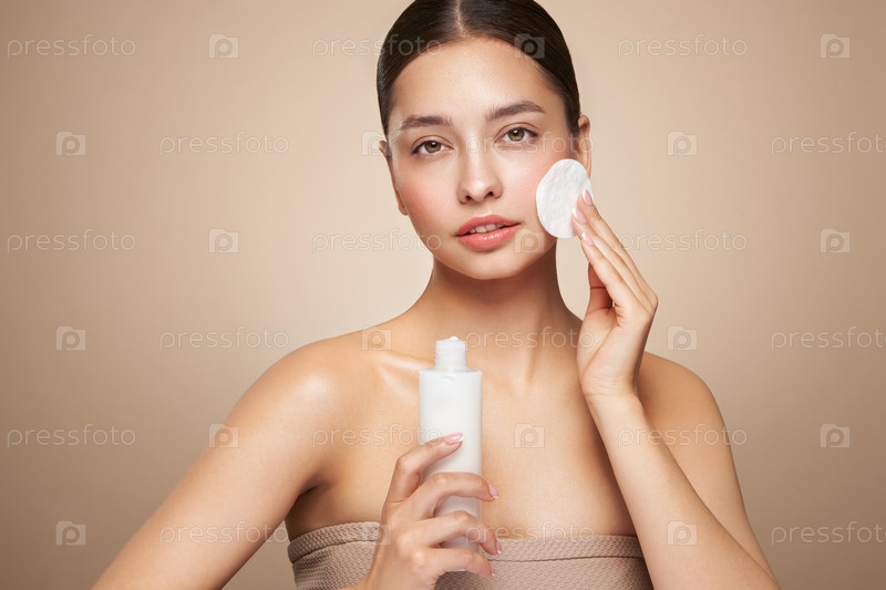Молодая женщина очищает лицо косметическим молоком