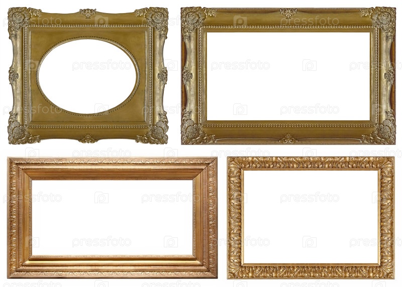 Набор золотых рамок для картин, зеркал или фотографий, изолированных на белом фоне