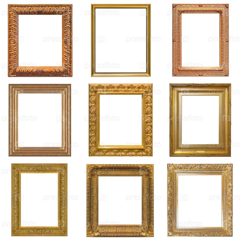 Набор золотых рамок для картин, зеркал или фотографий, изолированных на белом фоне