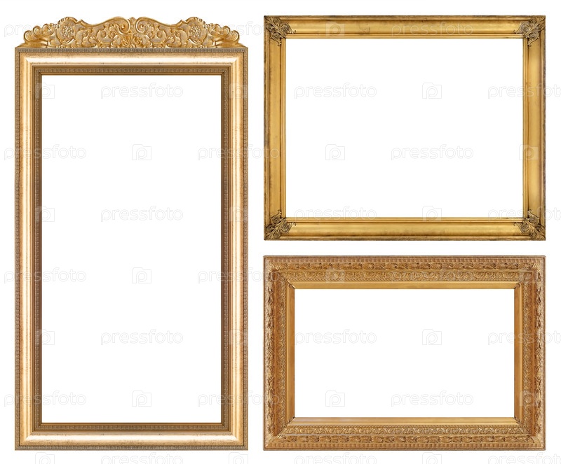 Набор золотых рамок для картин, зеркал или фотографий, изолированных на белом фоне