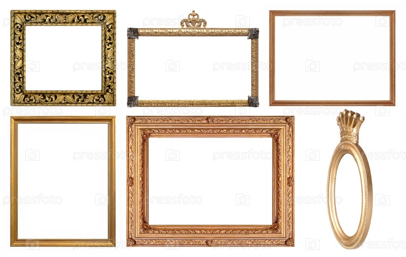 Набор золотых рамок для картин, зеркал или фотографий, изолированных на белом фоне