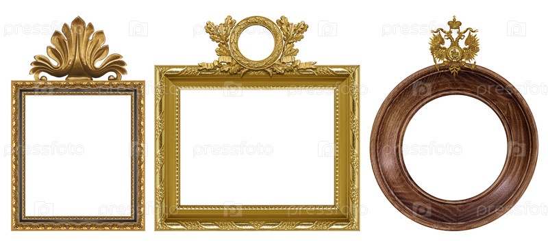 Набор золотых рамок для картин, зеркал или фотографий, изолированных на белом фоне