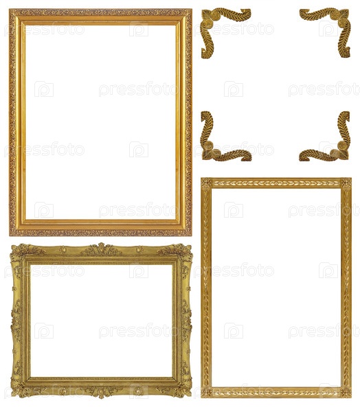 Набор золотых рамок для картин, зеркал или фотографий, изолированных на белом фоне