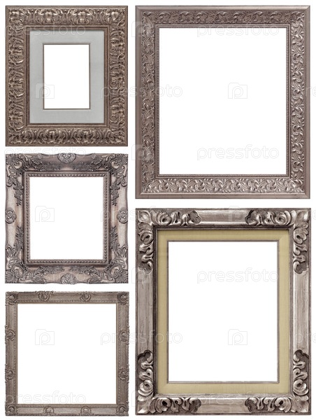 Набор серебряных рамок для картин, зеркал или фотографий изолированный на белом фоне