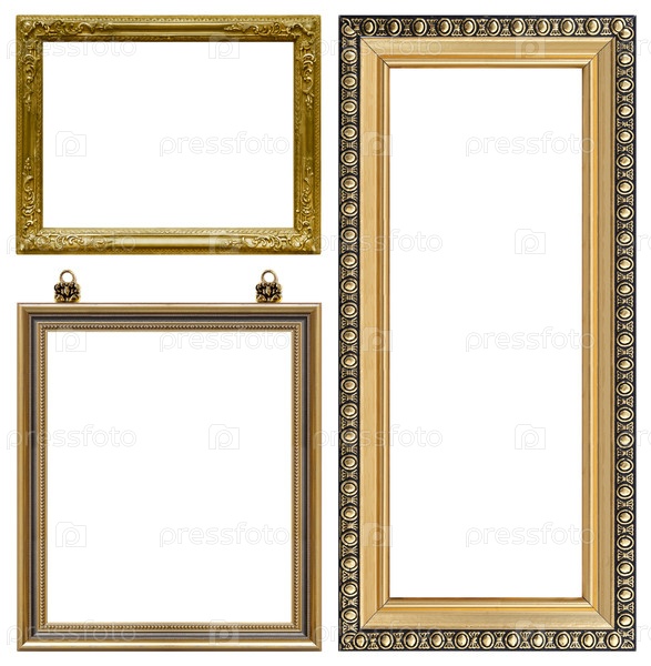 Набор золотых рамок для картин, зеркал или фотографий, изолированных на белом фоне