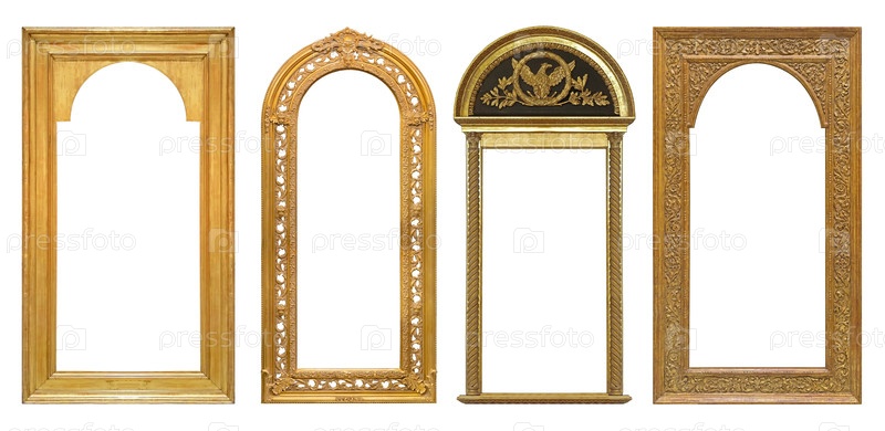 Набор золотых рамок для картин, зеркал или фотографий, изолированных на белом фоне