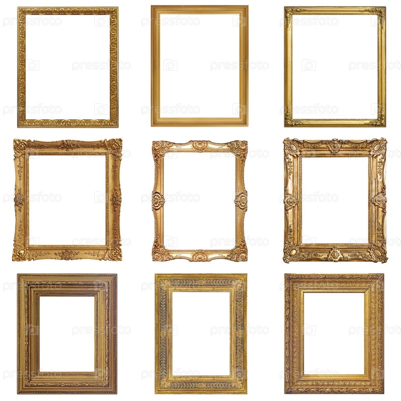 Набор золотых рамок для картин, зеркал или фотографий, изолированных на белом фоне